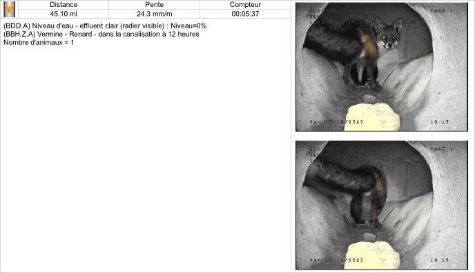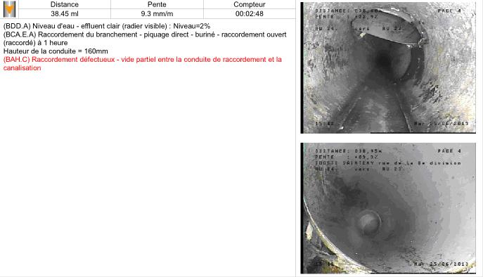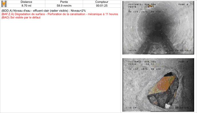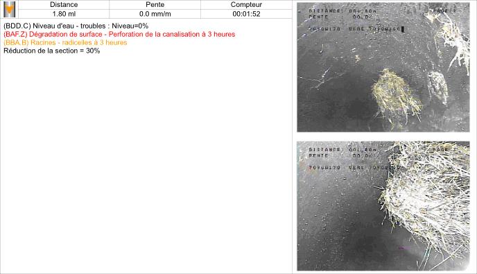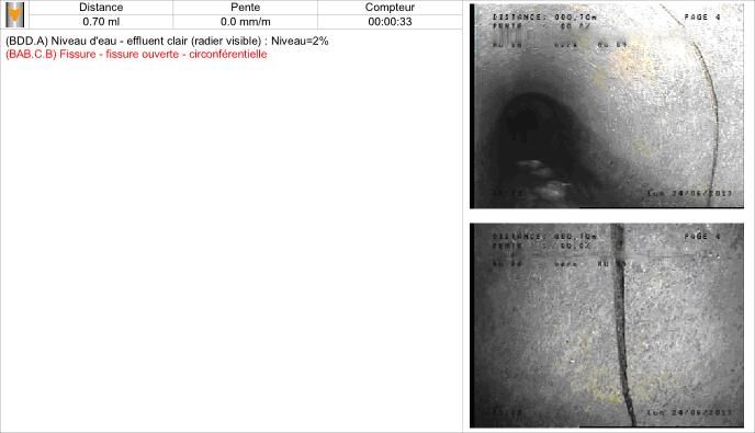 Ce type de contrôle permet de dresser un compte-rendu objectif de l’état des réseaux appuyé par un ensemble de mesures (distances, pentes, mesures de l’ovalisation). Chaque élément et défaut est répertorié et illustré par la photo correspondante dans le rapport final remis au client.